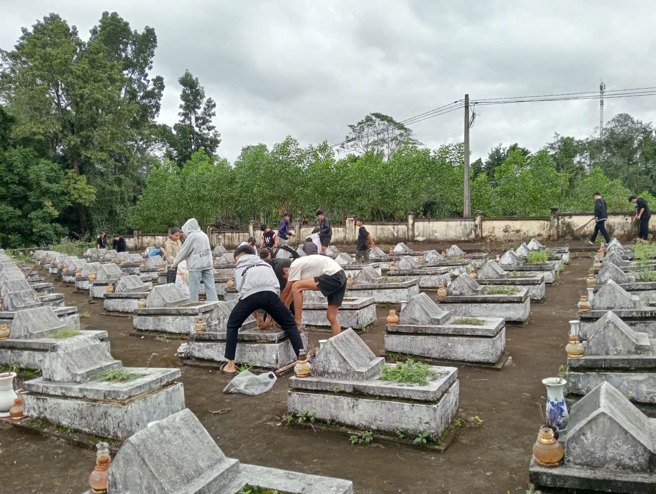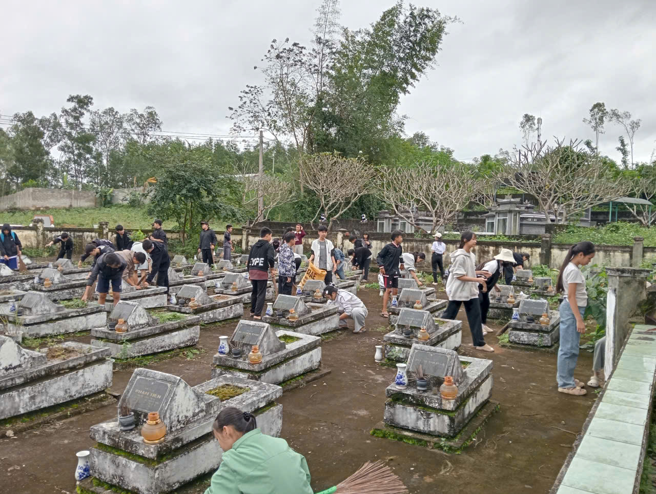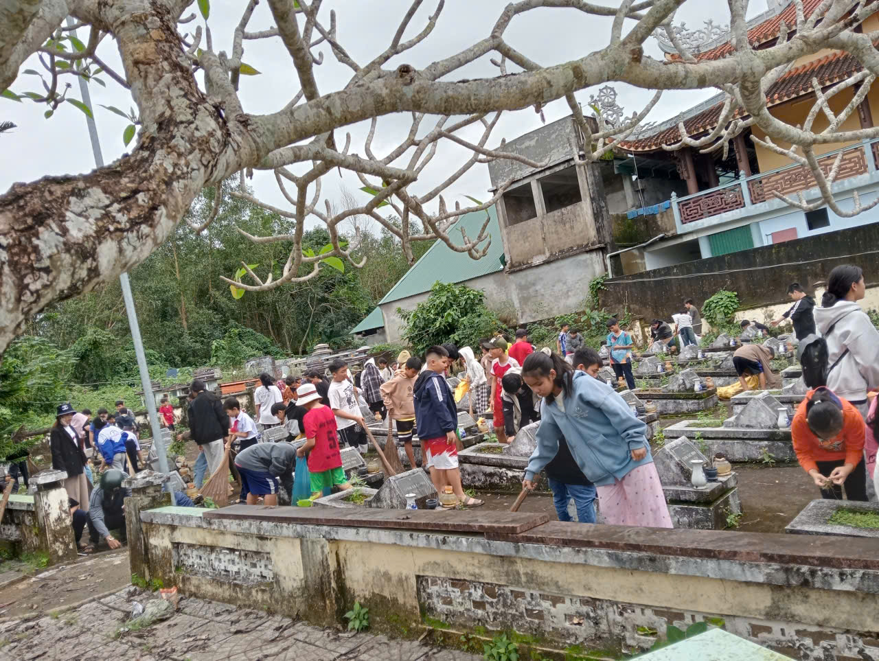 Trong không khí trang nghiêm và thành kính, các em học sinh đã tham gia quét dọn, nhổ cỏ, chỉnh trang khuôn viên nghĩa trang và thắp hương tưởng niệm. Dưới sự hướng dẫn của giáo viên, các em thực hiện công việc với tinh thần trách nhiệm, nghiêm túc và đầy xúc động.