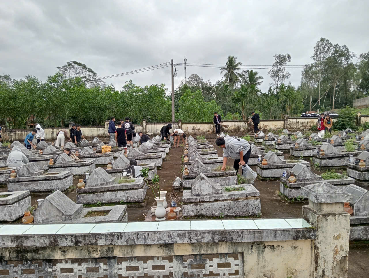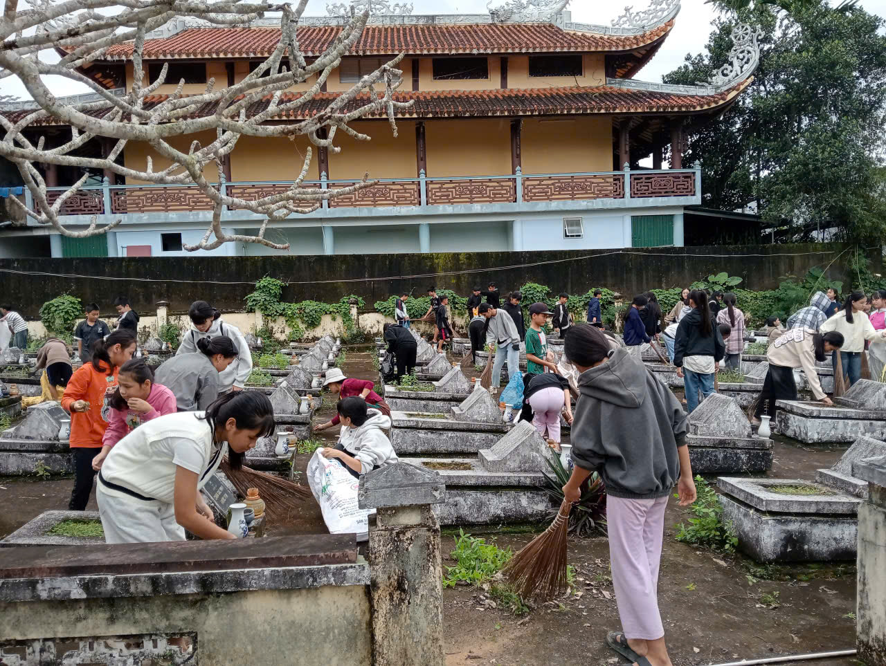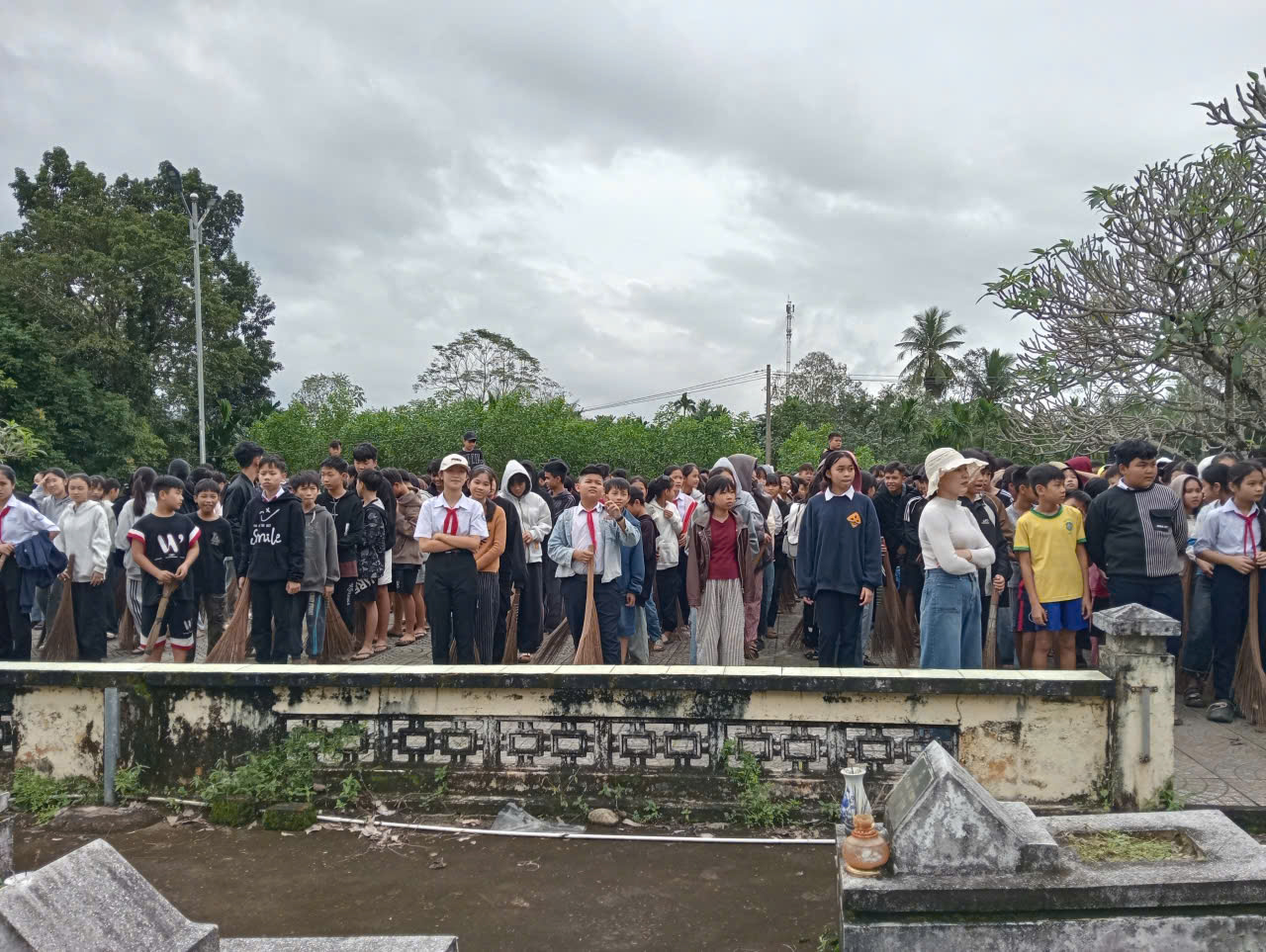 Trong không khí trang nghiêm và thành kính, các em học sinh đã tham gia quét dọn, nhổ cỏ, chỉnh trang khuôn viên nghĩa trang và thắp hương tưởng niệm. Dưới sự hướng dẫn của giáo viên, các em thực hiện công việc với tinh thần trách nhiệm, nghiêm túc và đầy xúc động.