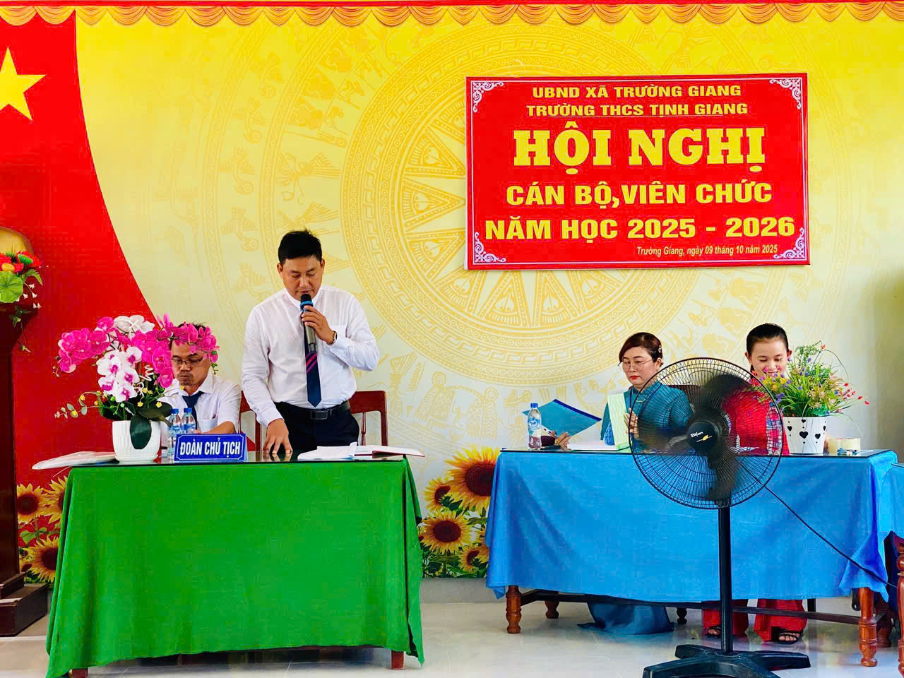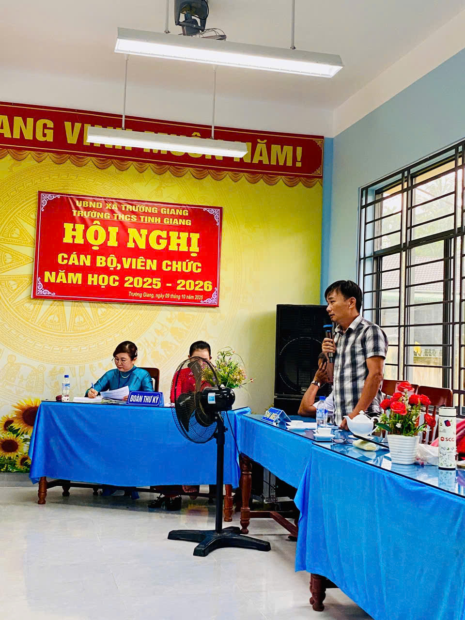Chiều ngày 09/10/2025, Trường THCS Tịnh Giang đã tổ chức Hội nghị viên chức năm học 2025-2026. Đây là dịp để toàn thể viên chức cùng nhìn lại, đánh giá kết quả đã đạt được trong năm học 2024 –2025; đồng thời thảo luận, thống nhất phương hướng, nhiệm vụ trọng tâm của năm học mới 2025 – 2026.