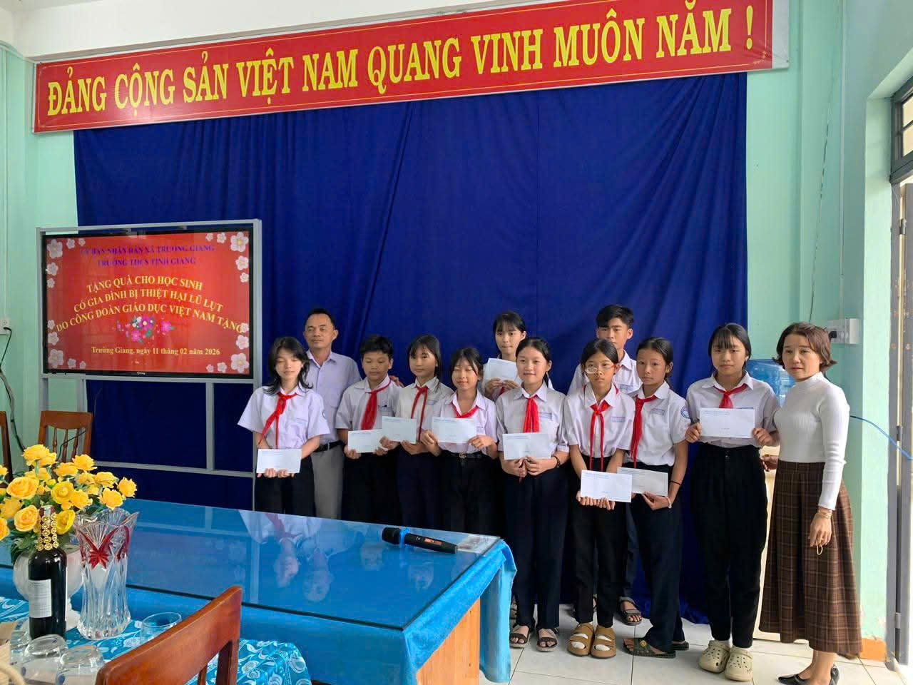 Sáng ngày 11/02/2026 trường THCS Tịnh Giang tổ chức trao quà cho các em học sinh có hoàn cảnh khó khăn, đặc biệt là những em bị ảnh hưởng bởi thiên tai, lũ lụt trong thời gian qua.